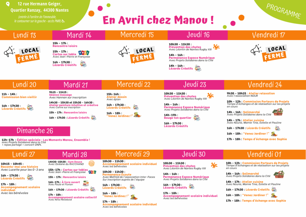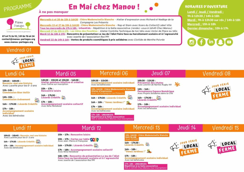 L’association Manou Partages est un facilitateur de lien social entre les générations, en proximité, pour contribuer à l’épanouissement et à l’équilibre de chacun par la transmission des savoirs et des richesses composantes des parcours de vie, ceci à travers un projet solidaire et collectif.