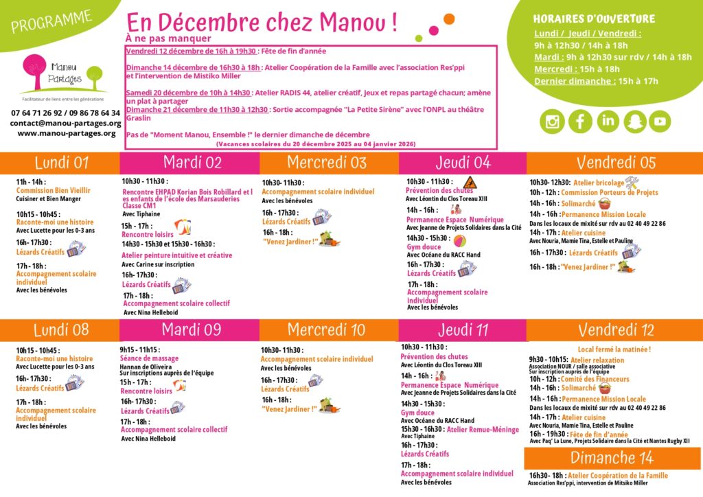 L’association Manou Partages est un facilitateur de lien social entre les générations, en proximité, pour contribuer à l’épanouissement et à l’équilibre de chacun par la transmission des savoirs et des richesses composantes des parcours de vie, ceci à travers un projet solidaire et collectif.